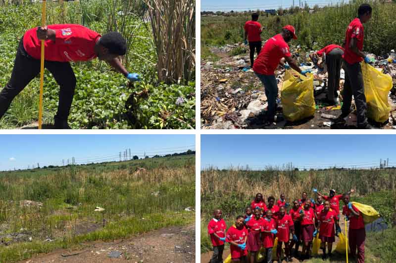 Pictured above: Participants engaging in the clean-up at the Ililaba Area Wetland in Thembisa.